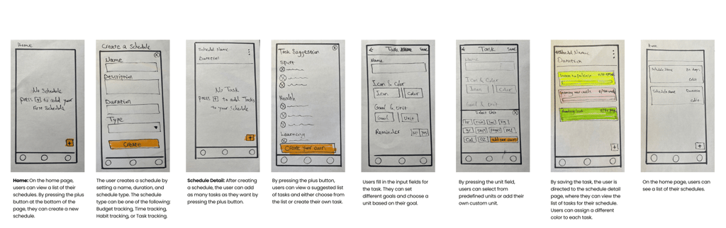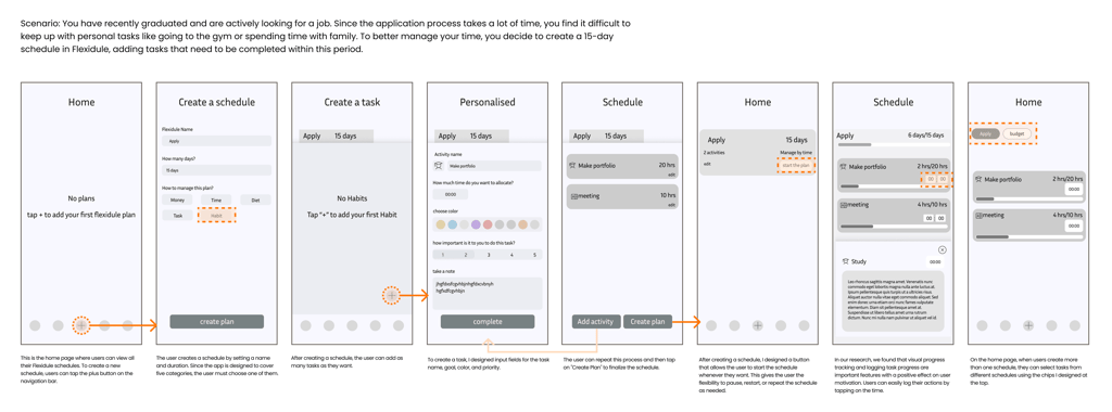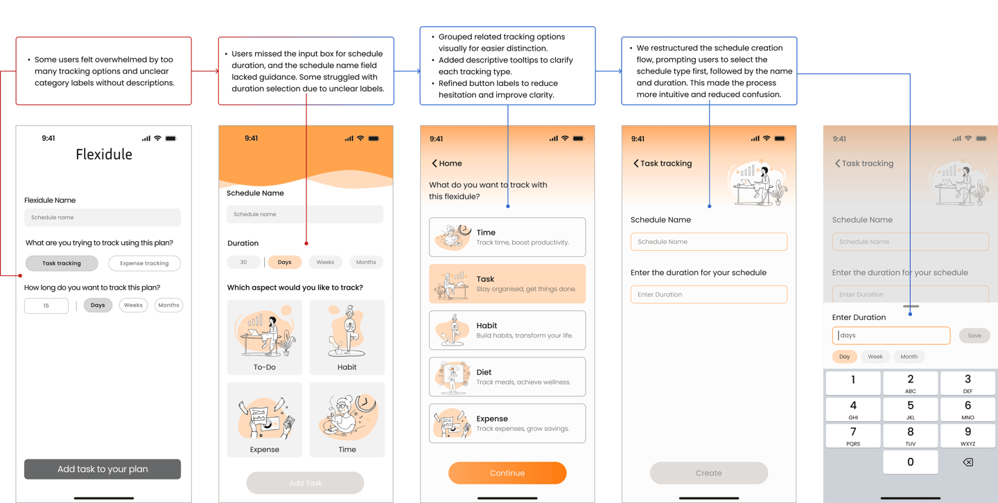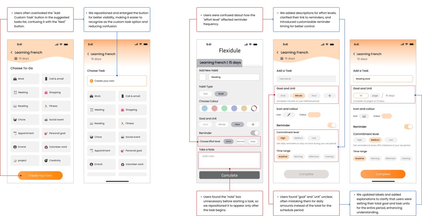 Our first test showed that flexibility alone wasn’t enough—users needed accountability to stay on track. Many felt a companion-like support system could help with motivation. To explore this, we ran a second test with five participants. Here’s how we conducted the test:
