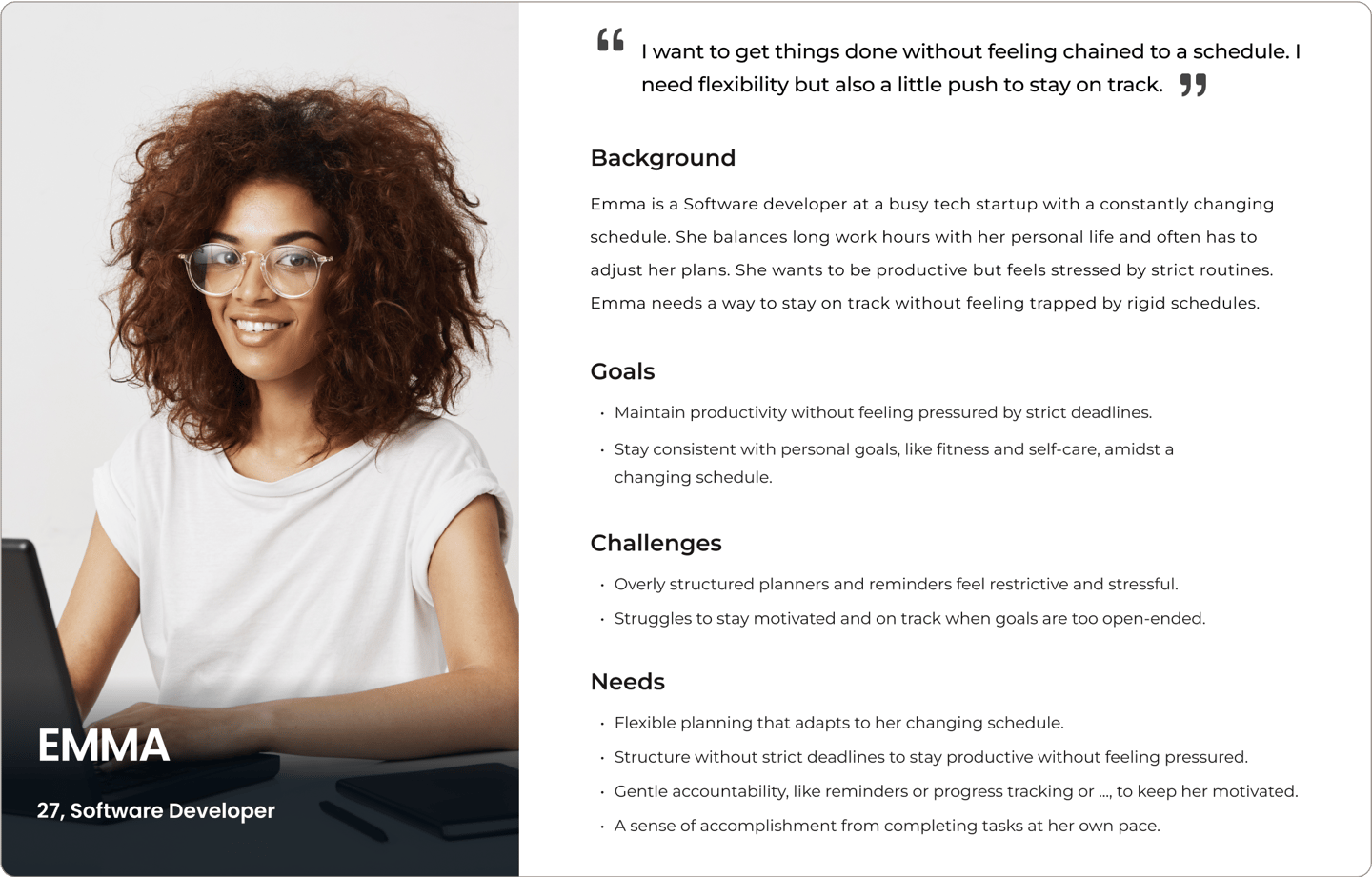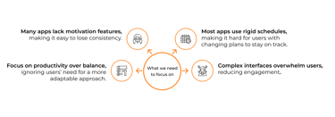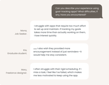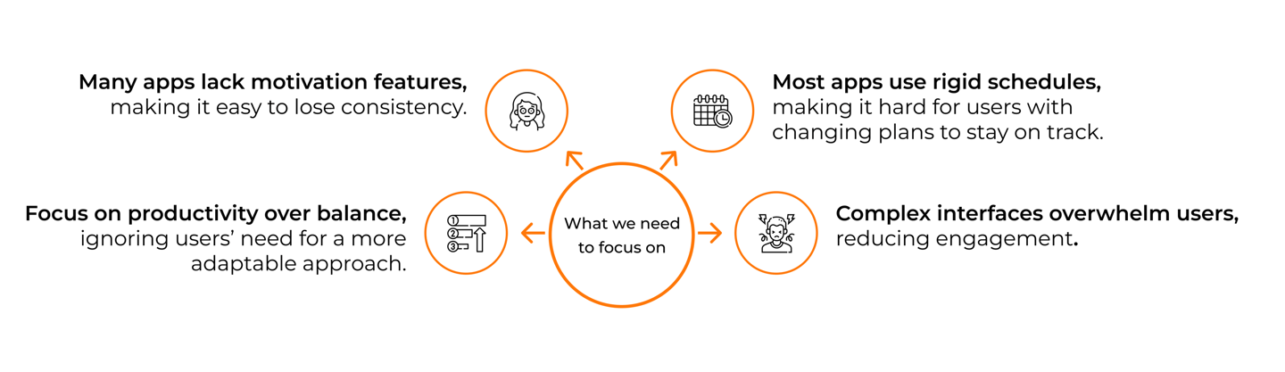 The biggest theme we found was related to flexibility and staying motivated. Rigid schedules made it hard for people to keep up, especially when their plans changed. As motivation dropped, there were not enough ways to adjust tasks or get back on track.