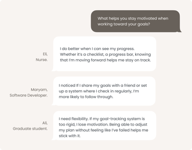 To answer above question and validate our assumptions we conducted survey to explore user behaviors, preferences, and challenges in goal setting.