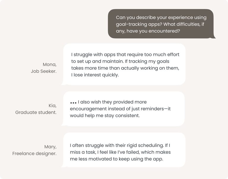 We conducted semi-structured interviews with 15+ users to validate our initial findings and further understand how people currently works on their goals, their motivations and challenges.