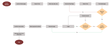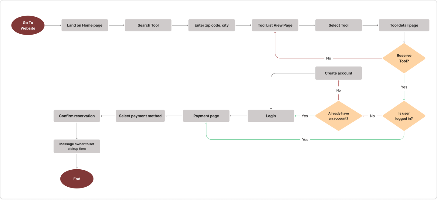With the user stories and features requirements from the project brief in mind, we developed a user flow diagram to ideate and visualize what screens and interactions users would go through whilst using the website.