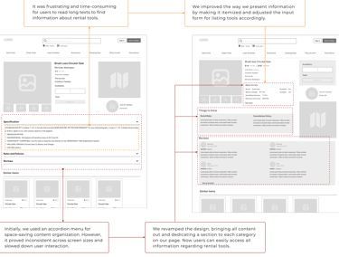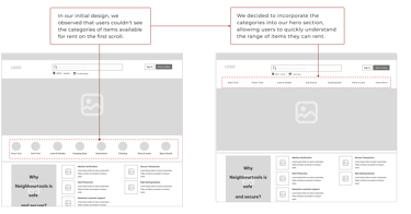 We looked at Facebook Marketplace, as a good customer to customer app and Airbnb, as a successful app for sharing personal properties, and eight other similar websites. By studying them, we learned valuable lessons to implement the user experience of our product. We used them to inspire to build our information architecture and user flow.