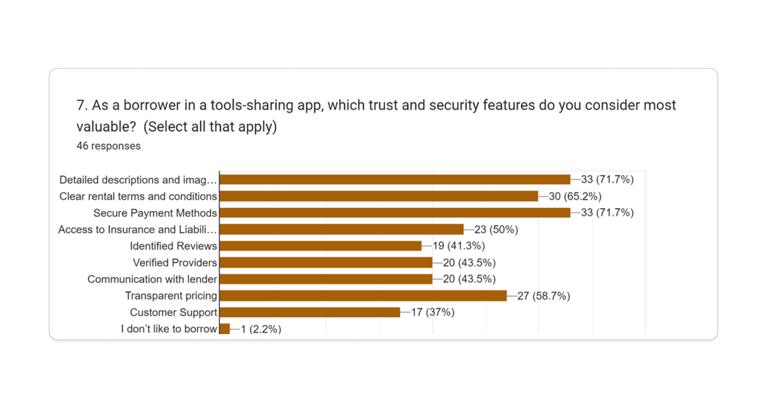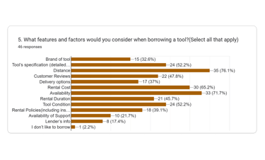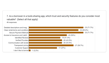 As part of our research and In order to connect with more people and understand more about the user's pain points, needs and what influence them to trust an app and borrow their tools we decided to design a survey. We received a total of 46 responses.