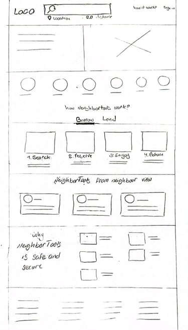We brainstormed and sketched various design ideas for the website, taking into consideration the needs and pain points of our user persona. We prioritized essential features, such as home page navigation, searching tools and creating a search result and tool's description pages. Through collaboration, we converged on a design that pulled elements from all the sketches. We then moved to the wireframing stage of the low-fidelity design.